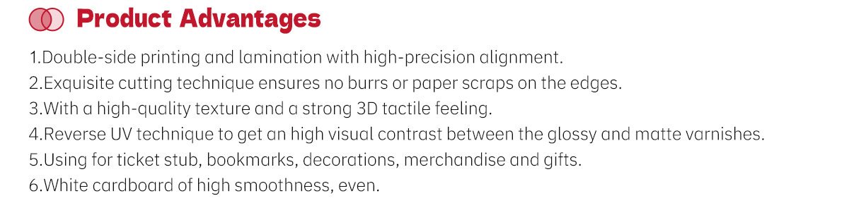 Using for ticket stub, bookmarks, decorations, merchandise and gifts.
